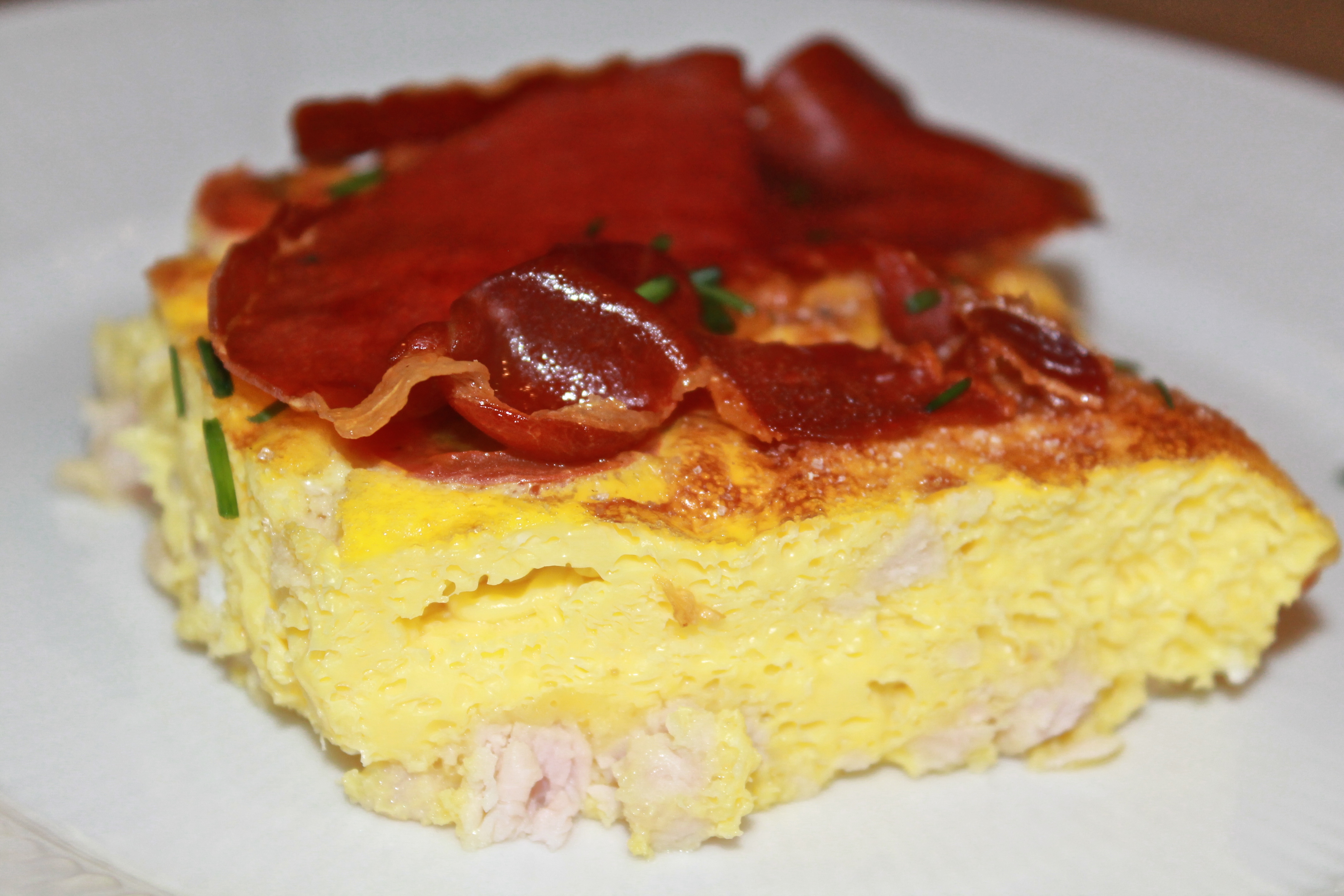 - Når serranoskinken er færdig, lægger du det sprøde serranoskinke oven på æggekagen