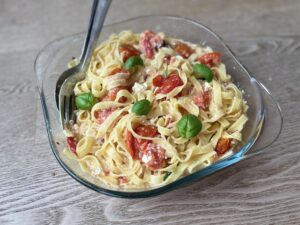 Og så er der serveret. En lækker pastaret, som kan fungere som tilbehør til aftensmaden eller som frokost 😛
