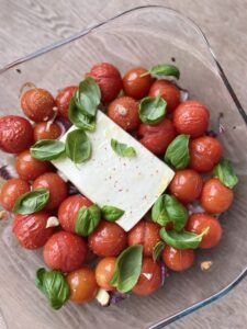 Bagt feta med cherrytomater er virkelig på den helt nye ting. Og det kan jeg virkelig godt forstå, det smager nemlig helt vildt godt og ret virkelig nemt at lave 😛