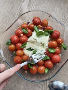 - Brug nu en gaffel til at masse fetaost og cherrytomater