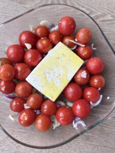 - Kom dine osteblok (feta eller salatost) ned i det ildfaste fad