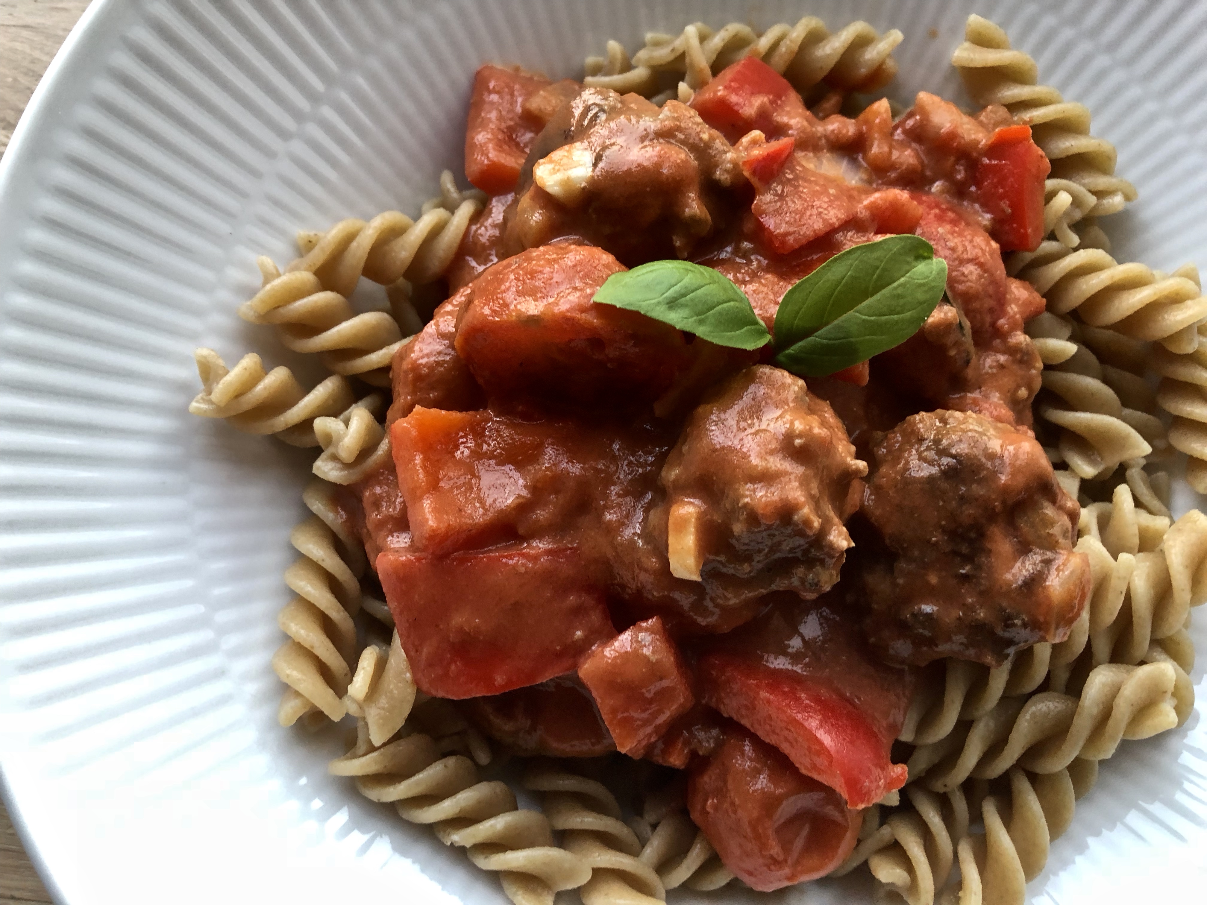 Nu kan du servere dine kødboller i cremet tomat-flødesauce med pasta – og det smager så godt 😛 Du kan også sagtens spise det uden pastaen. Det smager også rigtig godt 🙂